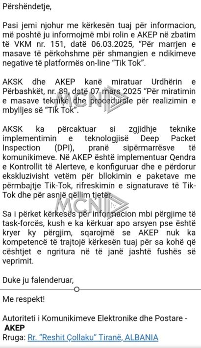 AKSK ka përcaktuar si zgjidhje teknike implementimin e teknologjisë Deep Packet Inspection (DPI), pranë sipërmarrësve të komunikimeve. Në AKEP është implementuar Qendra e Kontrollit të Alerteve,e konfiguruar dhe e përdorur ekskluzivisht vetëm për bllokimin e paketave me përmbajtje TikTok, rifreskimin e signaturave të TikTok dhe për asnjë qëllim tjetër.