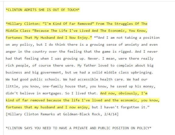 Një tezë që qëndron mirë përballë një kandidatit republikan Donald Trump, që është ndërkohë edhe një miliarder. Mirëpo materialet e publikuara nga WikiLeaks flasin se Clinton nuk e njeh mirë atë që ndodh në Amerikë. Nga një fjalim i saj në Wall Street, Clinton pranon se është “larg nga problemet e klasës së mesme [ër shkak të jetës që ka bërë dhe të mirëqenies që ajo dhe burri i saj gëzon”. Një miliarder përballë një njeriu që nuk di se çfarë ndodh në SHBA në një garë ku flitet kaq shumë për varfërinë. Gara është bërë simetrike në terma morali, kur përkundrejt videos problematike të Trump, një video audio e Clinton, e shfaq atë në një pozitë cinike si avokate kur mbronte një përdhunues.