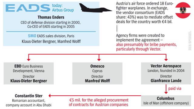 Sipas revistës gjermane “Der Spiegel”, rrjeti i kompanive guackë të “Airbus” loboi që të lejoheshin ryshfetet në Austri në mënyrë që të bleheshin 15 avionë ushtarak "Eurofighter" me një vlerë prej 2 miliardë dollarësh. Dyshohet për 100 pagesa potencialisht të paligjshme. Autoritetet austriake po hetojnë "Airbus" pas pretendimeve se kompania i ka paguar 183 milonë euro nën dorë “Komisionit”.