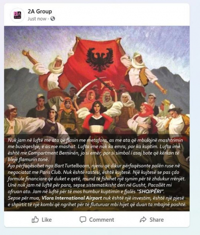 Mirëpo disa qëndrimeve të Pacollit për këtë çështje, paditës, 2A Group ka reaguar me një foto status ku citohet se ata që janë pas kredisë, janë rusë që duan të blejnë flamurin e Shqipërisë dhe këtu Pacolli na luan një rol agjenti.