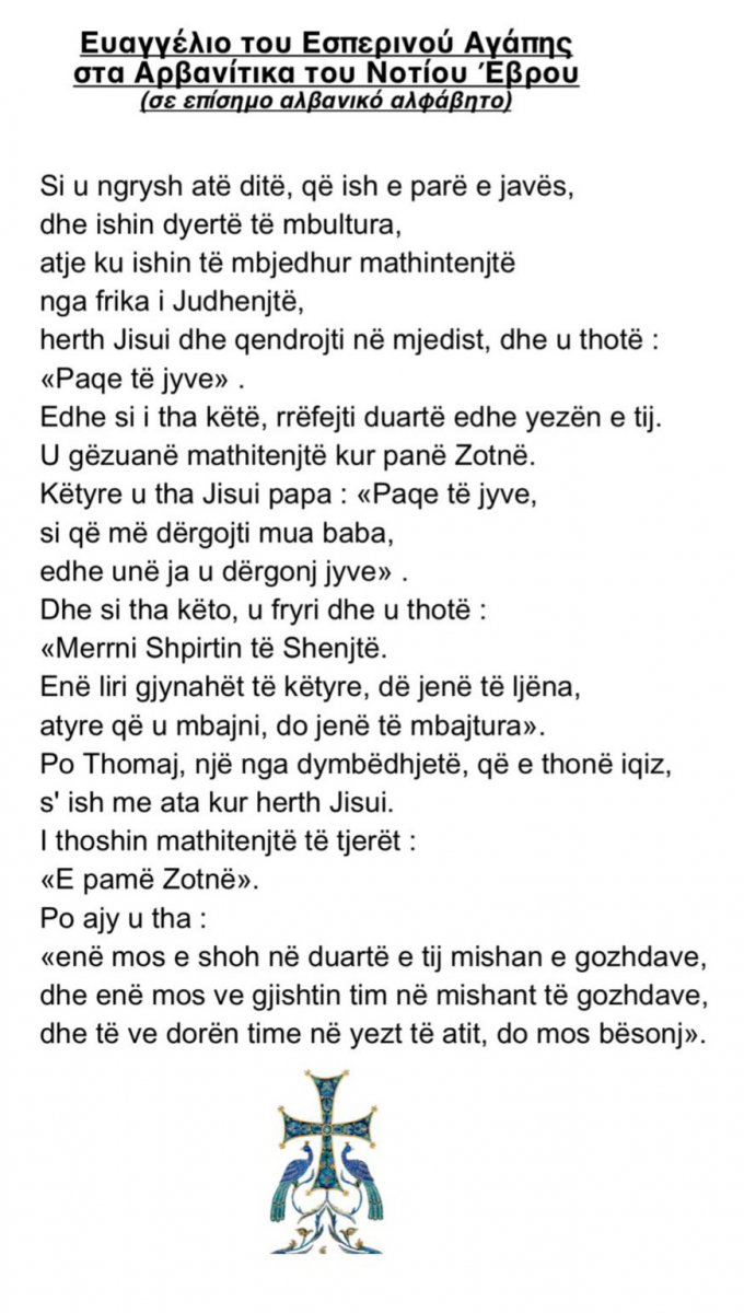 “Mbrëmësori i dashurisë”, është përkthyer fillimisht në vitin 2013 në arvanitisht nga Nathanail Kapsidhi, teolog dhe pedagog shumë i dashur ndër njerëzit e zonës me idenë që të përfshihet gjatë liturgjisë kishtare në Tihero dhe në fshatra të tjerë të Evrosit jugor. Në traditën kishtare ortodokse, “Mbrëmësori i dashurisë” këndohet të djelën e Pashkës në disa gjuhë. Kur e pashë përkthimin e Kapsidhit, pavarësisht se Kapsidhi në përshtatjen e tij ishte munduar të fuste shumë elemente arvanitase, nuk ishte tamam në arvanitishten tone, më tepër një kopje e “Mbrëmësorit” të shqipes. U këshillova me disa pleq në fshat dhe më pas kontaktova Kapsidhin, që t’i them për idenë time. U entuziasmua shumë dhe bashkarisht edhe me dy folës të tjerë shumë të mirë të arvanitishtes, e modifikuam në formën përfundimtare në arvanitisht. Që të katërt, të lumtur për rezultatin, i shtrënguam dorën njëri-tjetrit në fund. “Mbrëmësori” këndohet tashmë në kishat e fshatrave arvanitase të Evrosit jugor të djelën e Pashkës.