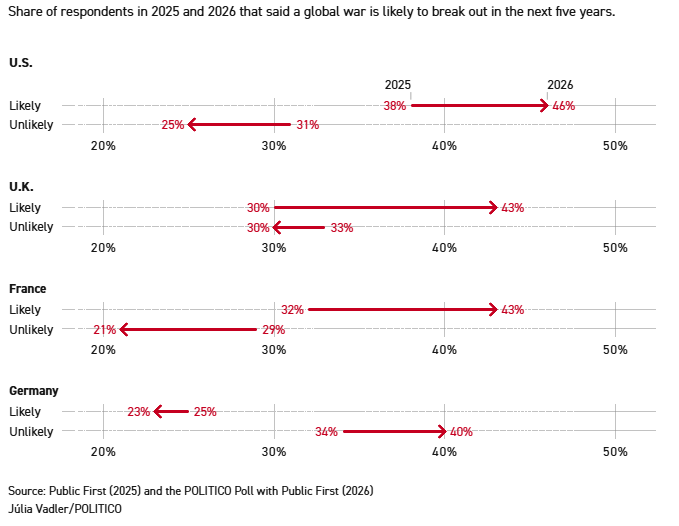 Shoqëritë perëndimore e shohin të mundshëm dhe të afërt eventualitetin e një lufte të tretë botërore. Konsideruar zakonisht si një dialektikë e një të ardhmeje të harruar, lufta e tretë po hyn në perceptim si realitet i mundshëm. Një sondazh i organizuar nga “Politico” me qytetarë në SHBA, Kanada, Mbretërinë e Bashkuar, Francë dhe Gjermani ilustron këtë evolucion në qëndrimin e shoqërive kryesore në Perëndim.
