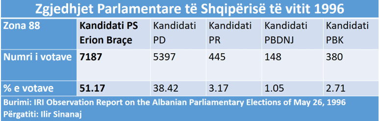 1. Rezultatin e deputetit Erion Braçe në zgjedhjet parlamentare të vitit 1996, në zonën njëemërore në qarkun Berat