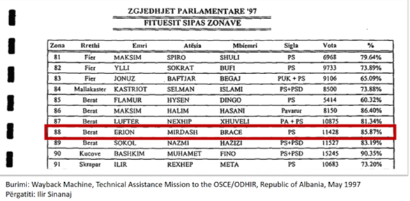 2. Rezultatin e deputetit Erion Braçe në zgjedhjet parlamentare të vitit 1997, në zonën njëemërore në qarkun Berat