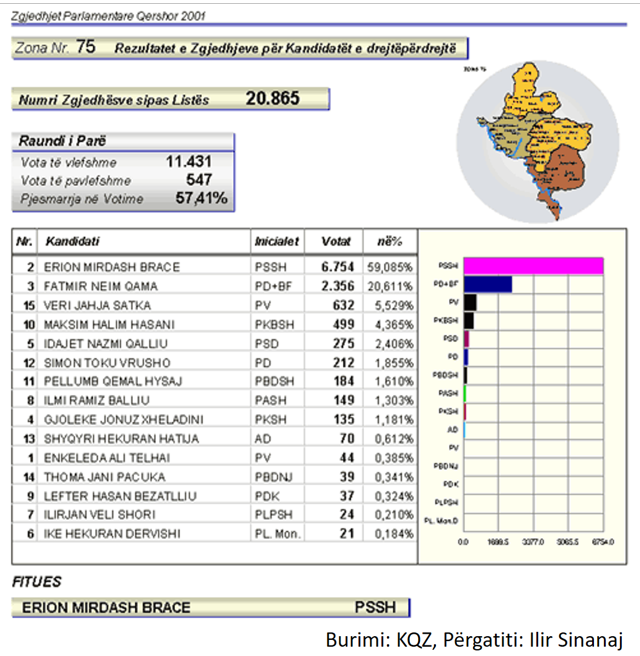 3. Rezultatin e deputetit Erion Braçe në zgjedhjet parlamentare të vitit 2001, në zonën njëemërore në qarkun Berat