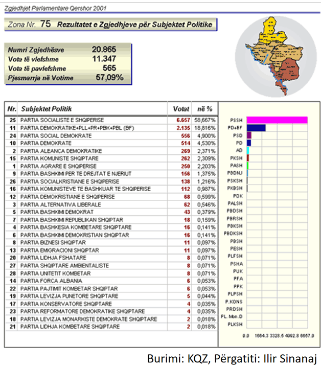 Për viti 2001 sistemi zgjedhor ishte i përzier, vetëm se këtë herë vetëm 100 deputetë zgjidheshin me zgjedhje mazhoritare, ndërsa 40 të tjerë me zgjedhje proporcionale nga listat shumëemërore të partive për të gjithë vendin. Kishte 2 fleta votimi, një për kandidatin dhe tjetra për partinë politike. Të dhënat gjenden në faqen e KQZ-së. Më poshtë lidhja:(https://cec.org.al/zgjedhjet-per-kuvend-2001/#tabs_desc_26197_4).