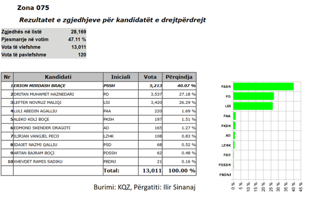 Në këto zgjedhje deputeti Braçe kandidonte në Zonën 75, ku mori 5231 vota apo 40.07% (pjesëmarrja 47,11%). Ndërsa PS-ja si parti në Zonën 75 mori 1060 vota apo 8.17% (pjesëmarrja 47.12%).