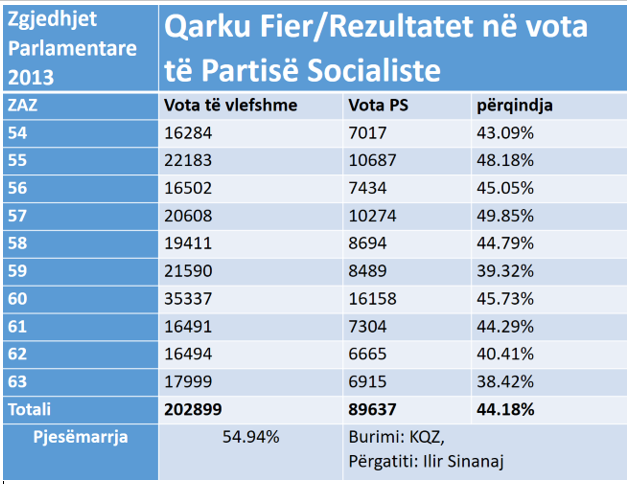 Sistemi zgjedhor i vitit 2013 ishte i njëjtë me atë të vitit 2009. Të dhënat për rezultatet zgjedhore për zgjedhjet parlamentare të vitit 2013 në shkallë ZAZ-je mund të gjehen në faqen e KQZ-së, por nuk mund të gjehet se cila ZAZ i përket kujt bashkie. Prandaj do të nxjerrim rezultatet për të gjitha ZAZ-të e qarkut Fier. Më poshtë lidhja(https://cec.org.al/fieri-zp-2013/).