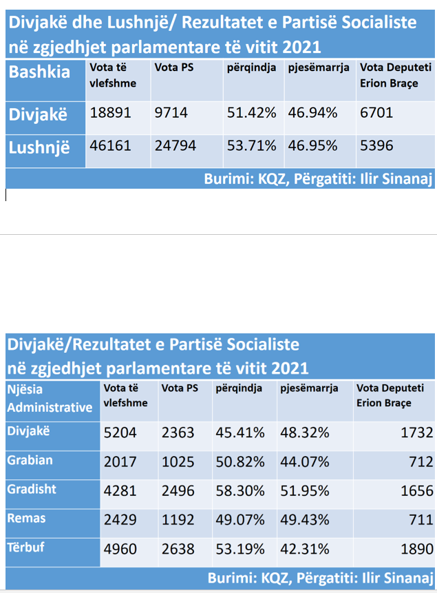 8. Rezultatin e Partisë Socialiste në zgjedhjet parlamentare të vitit 2021, në Zonat e Administrimit Zgjedhor të bashkisë Divjakë dhe në dy Zonat e administrimit Zgjedhor të Bashkisë Lushnjë, në qarkun Fier