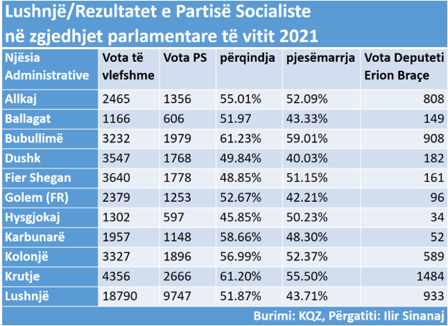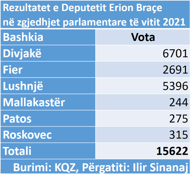9. Rezultatin e deputetit Erion Braçe në zgjedhjet parlamentare të vitit 2021, në qarkun Fier